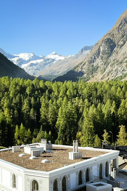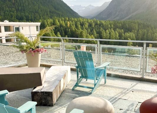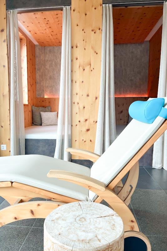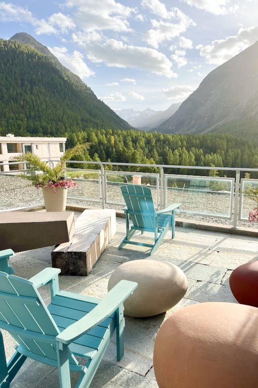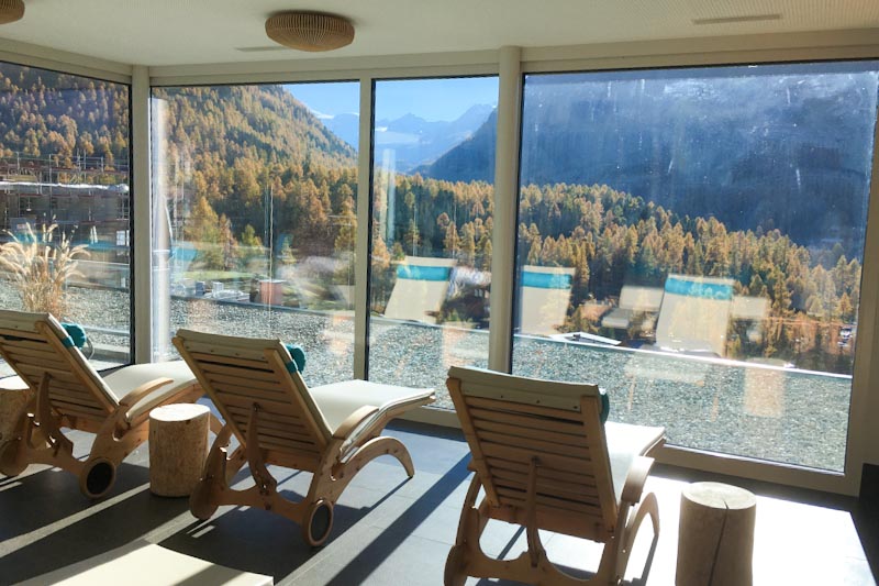 Auf dem Dach befindet sich der frisch renovierte Wellnessbereich mit traumhafter Aussicht ins Val Rosegg. Saunas, Dampfbad, Whirlpool, Ruheraum und Terrasse laden zum Verweilen ein.